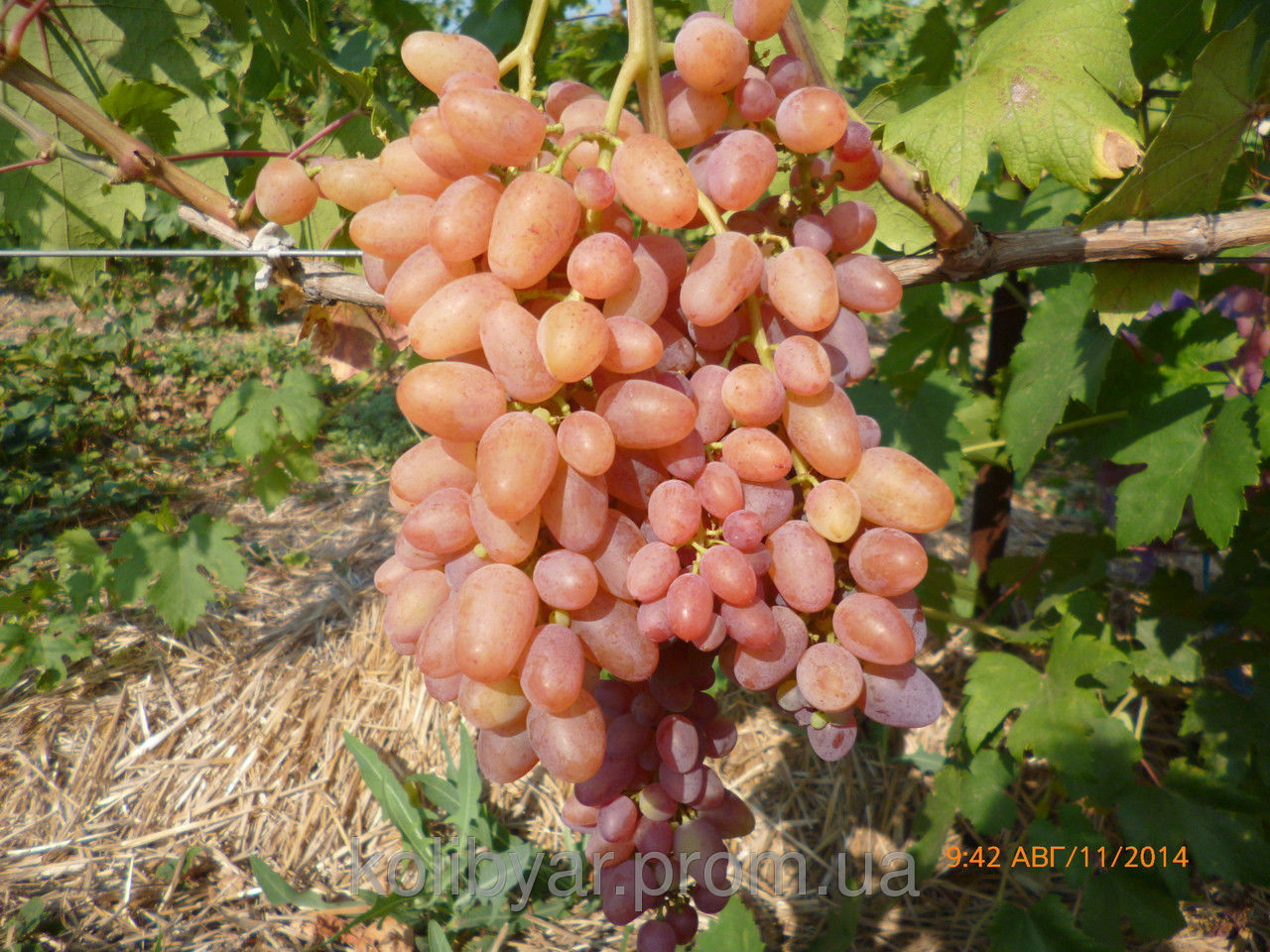 Ранний сорт. Коническая среднеплотная гроздь массой 700-1500г. Белые ягоды, 7-8г. Гармоничный вкус. Зимостойкость - 23°С