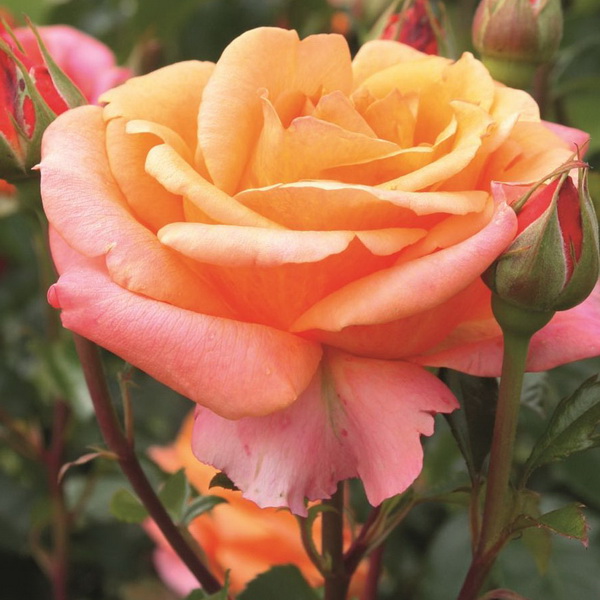 Цветок имеет удлиненный центр и многочисленное количество лепестков (около 45 шт.). Диаметр каждого хорошо развитого цветка составляет около 10 см. Рыжый оттенок изнутри бутона плавно переходит в темно-оранжевый и завершается лепестками вишневого оттенка. На стебле практически отсутствуют шипы. Растение высотой 60-70см."