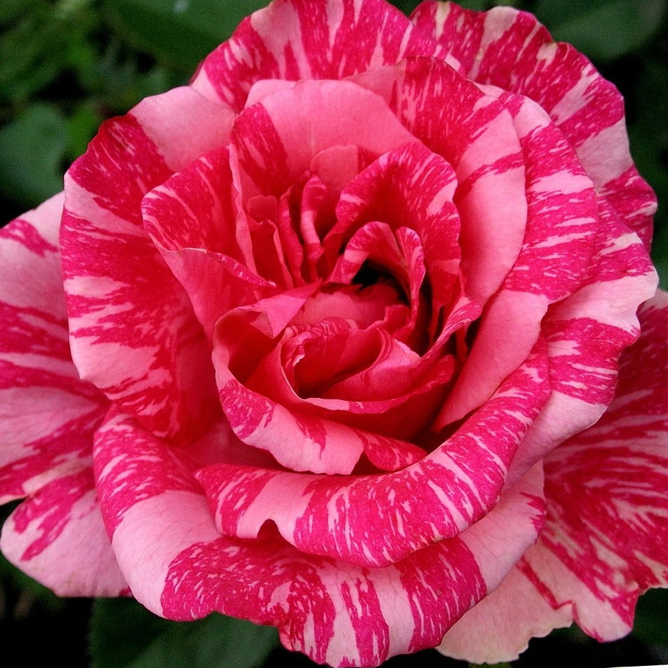 Бледно-розовые лепестки исчерченные розово-малиновыми темными прожилками. Диаметр цветка 10-12см. Насыщенный аромат. Высота куста 80-100см."