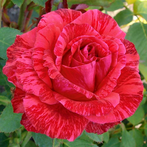 Темно-красные лепестки с бордовыми полосами. Цветок махровый, крупный -- 12см в диаметре. Куст высокий. Высота кустов 100-120см, ширина -- 70см."