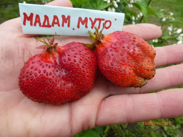 Плоды Мадам Муто огромны, за что она получила имя Fraize Tomate ( клубничный помидор). Ягоды могут быть от 80 до 120 граммов, конической формы, ярко - красные. Плоды сладкие и очень вкусные.