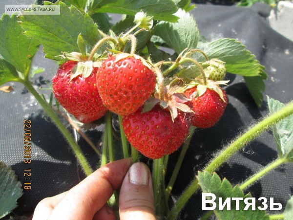 Ягоды клубники Витязь конической формы. По размеру больше в ширину, чем в длину. Поверхность ягод равномерно красная, на ней есть вдавленные семена. Вес ягод может колебаться от 10 до 40 г, но в большинстве случаев клубника вырастает крупной. Кусты сорта Витязь немного раскидисты, их форма напоминает полукруг. Листья на них зеленые, не слишком пузырчатые, слегка вогнутые. В кустах этого сорта небольшое количество усов.