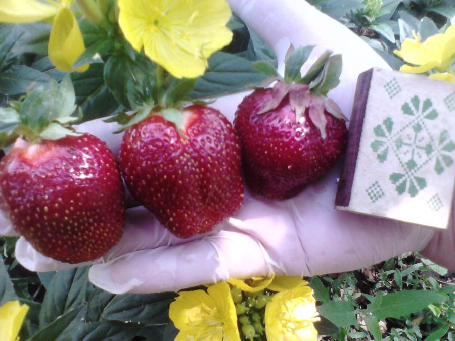 Ягоды образуются крупных размеров, весом от 15 до 30 г и имеют конусообразную форму с наличием выраженной шейки. Кожица багрового цвета, с характерно выраженным блеском. Семянки многочисленные, окрашены в желтоватый или багровый цвет, относительно сильно вдавленные в ягодную мякоть. Клубничная мякоть плотная, сочная. Вкусовые качества хорошие. Вкус кисловато-сладкий, с ярким ароматом.