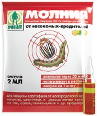 Лямбда-цигалотрин 50 г/л Ампула 2 мл в пакете Высокоэффективный препарат от комплекса вредителей на овощах, картофеле, розах и др. цветочных культурах. Результат через 30 минут. Не проникает в растения. Молниеносный эффект! Молния — это новый высокоэффективный препарат от колорадского жука на картофеле и комплекса вредителей на розах и других декоративных растениях. Молния обладает выраженным «нокдаун»-эффектом. Гибель насекомых наступает уже через 30 минут. Высокая активность препарата сохраняется в течение 2-3-х недель. Специальные добавки обеспечивают устойчивость к смыванию дождем. Подавляет развитие паутинных клещей. Это позволяет избежать дополнительной обработки специализированным средством от паутинных клещей. Преимущества: Видимый результат уже через 30 минут! Экономичность — 2 мл на 1 сотку посадок. Не проникает в растения. Молния — один из самых эффективных препаратов в классе пиретроидов.