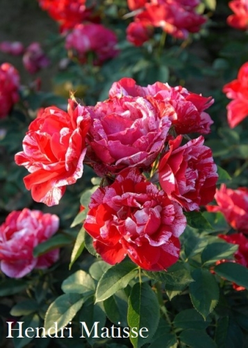 Несмотря на сложную гибридизацию, Henri Matisse очень похож на старинную полосатую розу Ferdinand Pichard. Цветки у него такого же малинового тона с розовыми полосками и потеками. Элегантные цветки появляются по одному или в довольно плотных кистях до 7 шт. Цветоносные побеги довольно длинные, и сорт иногда используют для промышленной срезки, но производители считают что сорт недостаточно обильно цветет для этих целей. Однако, это хорошая роза для сада, и довольно устойчивая к болезням. (ARE)